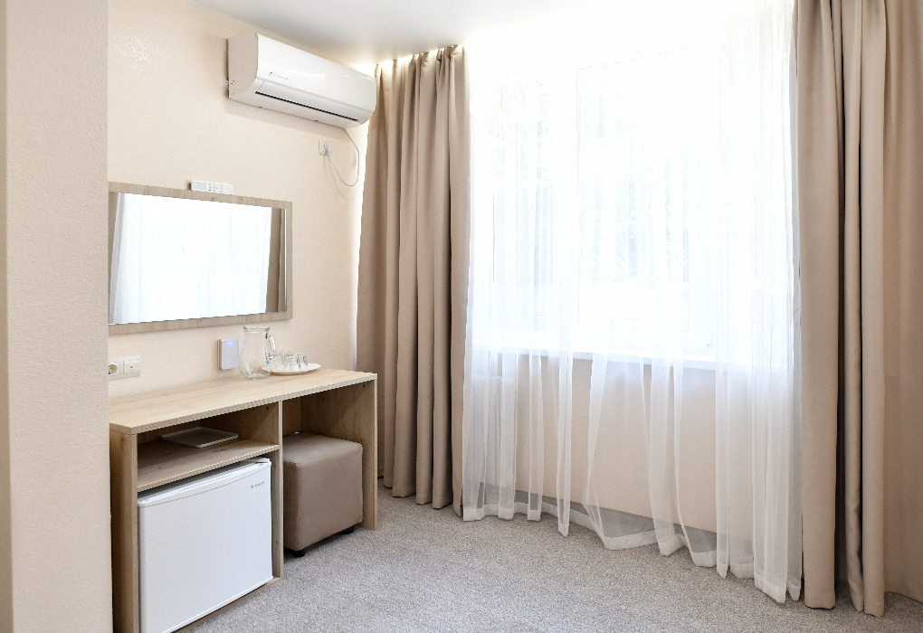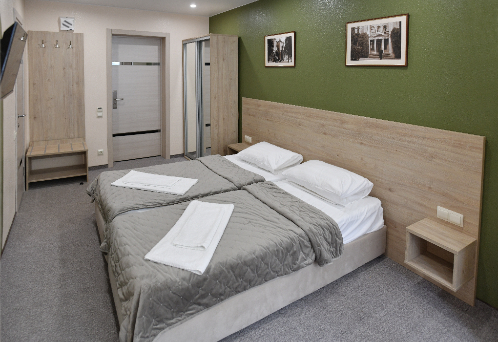 Площадь номера - 30-33 кв.м. 2 комнаты. 4 осн. места. вид на парковую зону. В номере: телевизор; холодильник; кондиционер; душ; туалет; фен; Wi-Fi; 2-спальная кровать; 1-спальные кровати; чайник; французский балкон. 1 доп. место: Еврораскладушка - предоставляется без ограничений по возрасту, не во всех номерах.